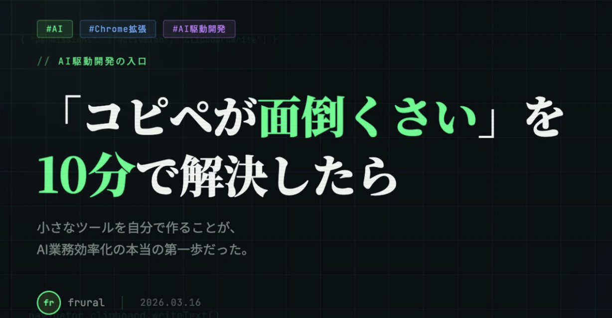 今回私が作ったのは、ページのタイトルとURLをワンクリックでコピーできるChrome拡張機能。めちゃくちゃ地味です。でもこれが、AI駆動開発の練習台として最高でした。